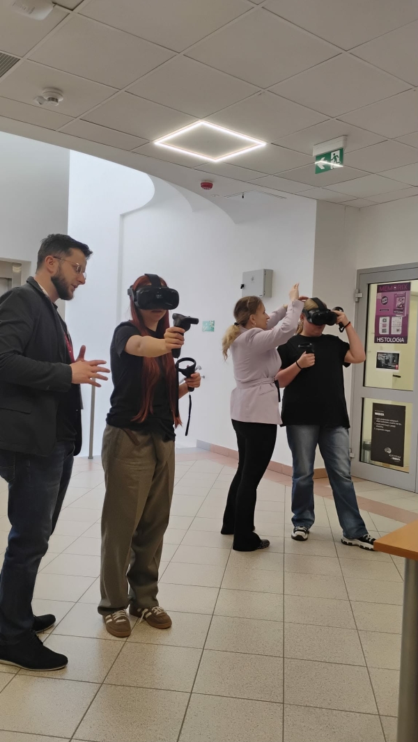 Następnie uczestnicy wzięli udział w czterech wybranych warsztatach i prezentacjach prowadzonych przez wykładowców uczelni. Zajęcia okazały się wyjątkowo interesujące nie tylko ze względu na tematykę – obejmującą m.in. patomorfologię, immunologię czy apiterapię – ale również dzięki możliwości praktycznego wcielenia się w rolę studentów medycyny. Uczniowie mieli okazję m.in. „podróżować” w głąb ludzkiego ciała przy użyciu gogli VR.