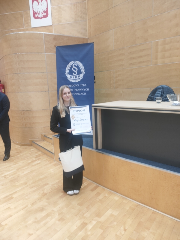 Z dumą informujemy, że Kinga Strączek, uczennica naszej szkoły, zajęła II miejsce w prestiżowym IV Międzyszkolnym Konkursie Prawniczym o Puchar Dziekana OIRP Katowice oraz o indeks Kierunku Prawo, który odbywa się pod patronatem Dziekan Wydziału Prawa i Administracji Uniwersytetu Śląskiego. To ogromne wyróżnienie, ponieważ konkurs kierowany jest do uczniów szkół średnich z całego regionu, którzy planują związać swoją przyszłość z prawem oraz chcą sprawdzić swoją wiedzę z zakresu nauk prawnych. Wydarzenie to cieszy się dużym prestiżem i stanowi doskonałą okazję do rywalizacji na wysokim poziomie.