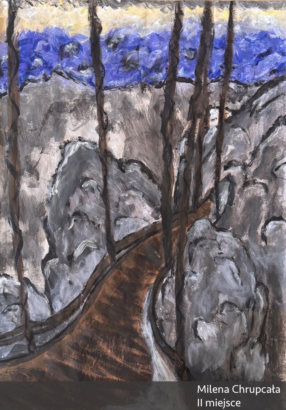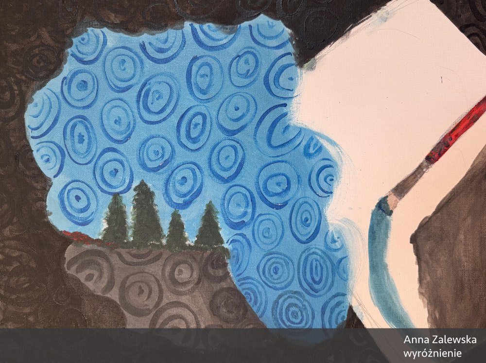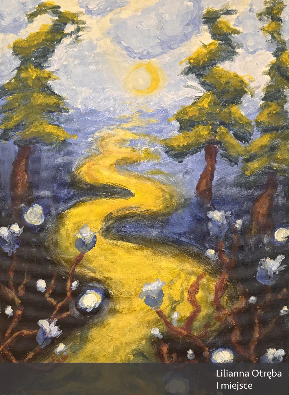 Jej praca wyróżnia się klimatem oraz grą światła nadającą obrazowi nieco baśniowy i magiczny charakter. Świetlista, kręta droga biegnie centralnie przez płótno, prowadząc oko widza od kontrastowego, ciemnego dołu, do rozjaśnionej góry obrazu. Kształty się rozmywają, a kwiaty i drzewa tworzą pewnego rodzaju ramę kompozycyjną. Jest tutaj zarówno nastrój jak i pewnego rodzaju emocjonalne napięcie. Wielkie brawa dla młodej malarki za tak interesującą interpretację tematu!