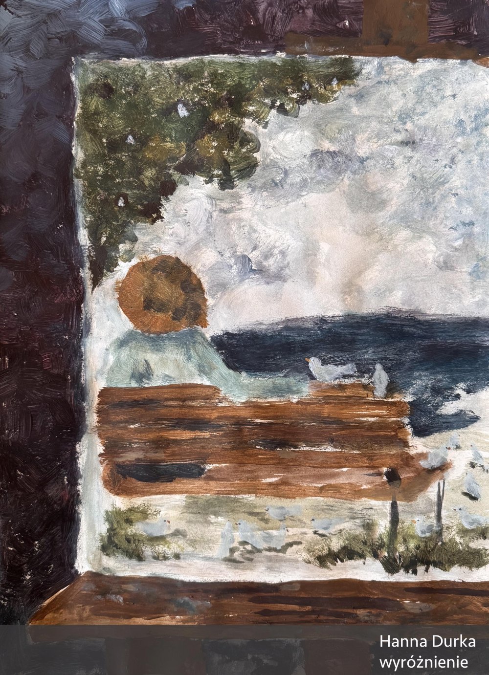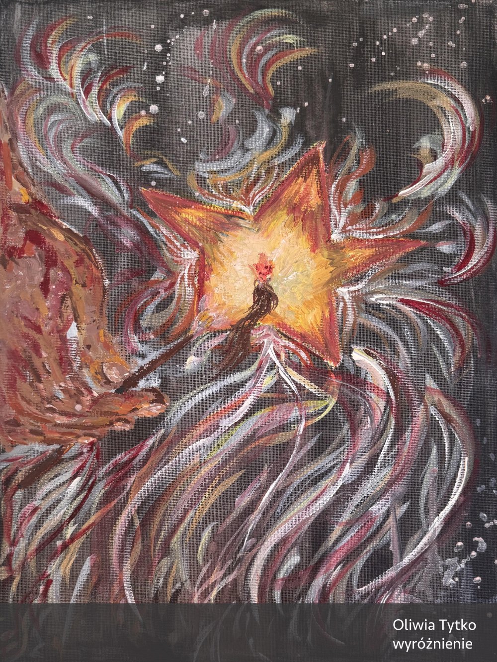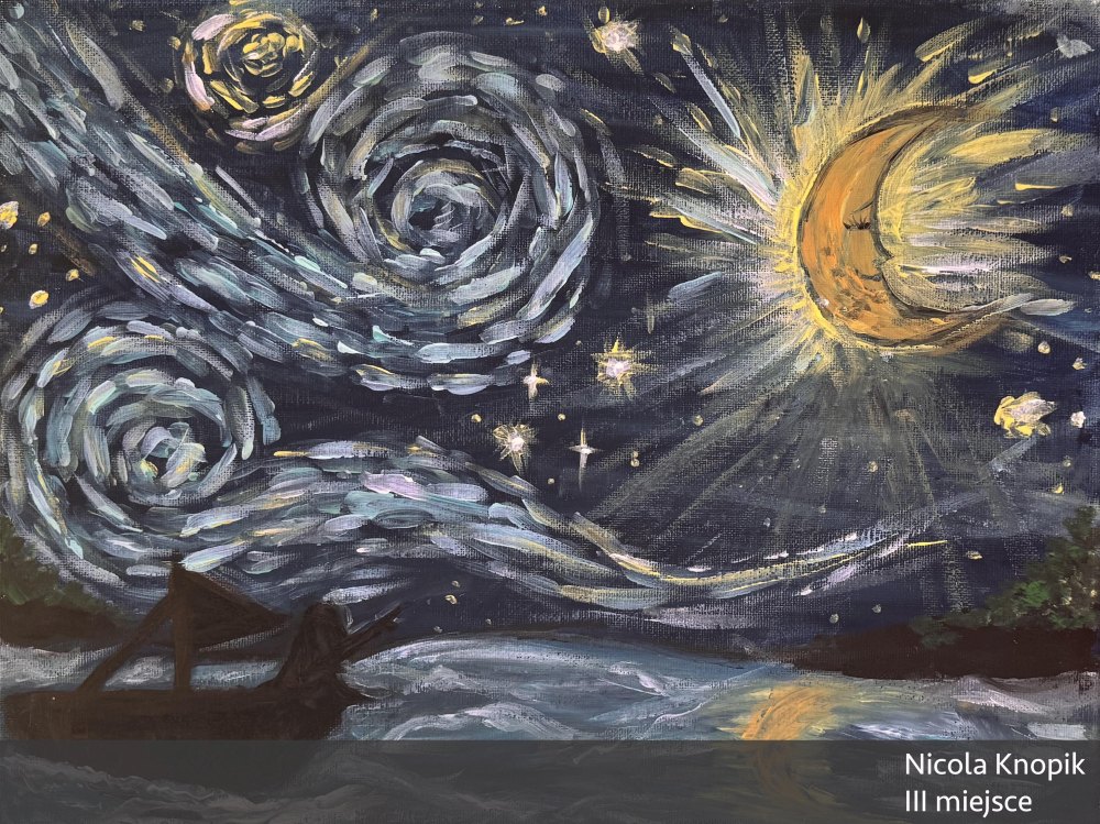 Jej praca wyróżnia się klimatem oraz grą światła nadającą obrazowi nieco baśniowy i magiczny charakter. Świetlista, kręta droga biegnie centralnie przez płótno, prowadząc oko widza od kontrastowego, ciemnego dołu, do rozjaśnionej góry obrazu. Kształty się rozmywają, a kwiaty i drzewa tworzą pewnego rodzaju ramę kompozycyjną. Jest tutaj zarówno nastrój jak i pewnego rodzaju emocjonalne napięcie. Wielkie brawa dla młodej malarki za tak interesującą interpretację tematu!