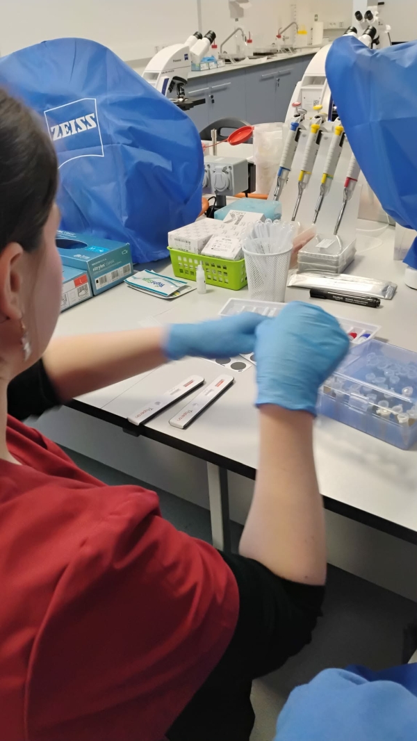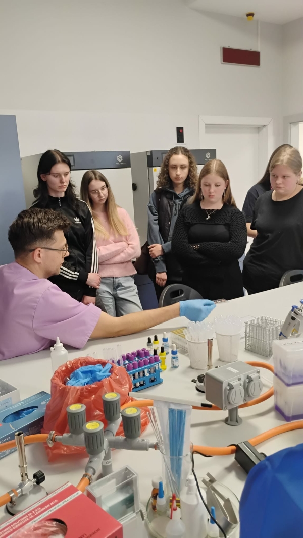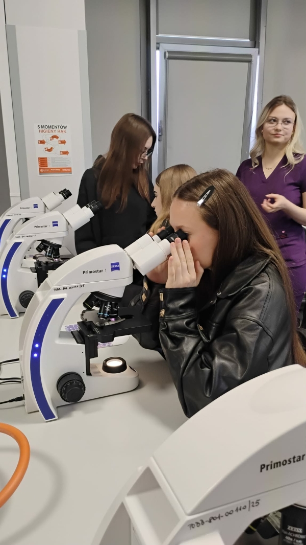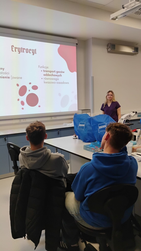 Następnie uczestnicy wzięli udział w czterech wybranych warsztatach i prezentacjach prowadzonych przez wykładowców uczelni. Zajęcia okazały się wyjątkowo interesujące nie tylko ze względu na tematykę – obejmującą m.in. patomorfologię, immunologię czy apiterapię – ale również dzięki możliwości praktycznego wcielenia się w rolę studentów medycyny. Uczniowie mieli okazję m.in. „podróżować” w głąb ludzkiego ciała przy użyciu gogli VR.